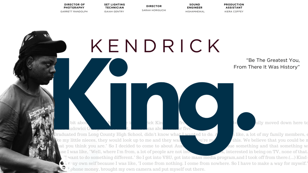 For King, success isn’t defined by a single project or achievement—it’s about the community he’s built along the way. “When I do pictures for people, or if I do video, if I do graphics for somebody, we still build that relationship. It’s like I’m family. They see me out and about and remember me. They treat me like [a] cousin.” Looking ahead, King hopes to continue serving as a mentor, showing others that they don’t have to settle. “I wanna show people that you can actually make it. If you put your mind to it. We only have one time to live this life, and it’s shorter than we think. Why not do something that we love?”